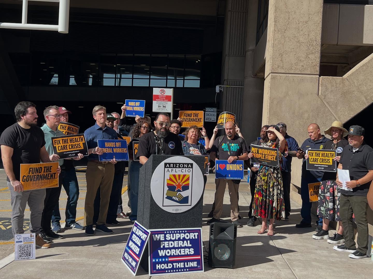 The event featured remarks from U.S. Representatives Greg Stanton and Yassamin Ansari, and leaders from the Ariz. Speakers emphasized the urgent need to fund government services and protect health care coverage for working families.